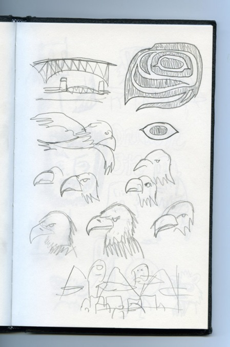 "Vancouver just has too much to see and do, even in the rain. The drawings I did for the show feed off images and the environment of this city. As I was working on the pieces (that you can see at the show), I had a few printouts of pics I took while roaming around. Along with photos, I did a couple sketches of stuff related to Vancouver.