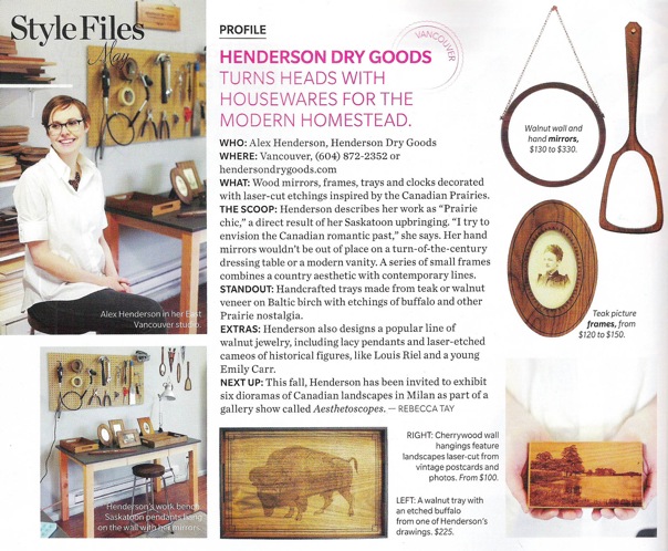 "Alex Henderson is a Vancouver based industrial designer and artist. She has been selling her hand-made products at stores across Canada for the past 8 years. She currently owns and operates her own design company--Henderson Dry Goods--for which she makes a variety of home accessories and jewelry made almost exclusively out of wood, and that are truly more like works of art than objects of design."