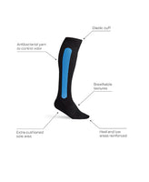 - Knee-high, extra cushioned sole area, heel and toe areas reinforced, elastic cuff