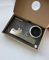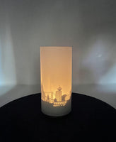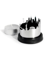 With attention to detail, the dekoop tealight holder makes cities shine. The city light consists of a three-part set: transparent shade, a base for tea lights and a city outline made of spring stainless steel. Once put together, the respective city silhouette is projected onto the outer cover made of transparent paper using a tea light. It makes cities glow, striking buildings and bridges cast their shadows on the screens.
