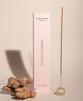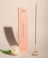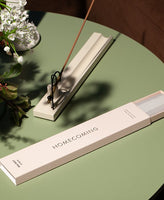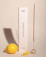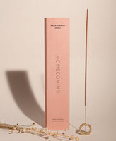 Homecoming incense is made from pressed wood and infused in-house using a blend of premium essential oils, phthalate-free fine fragrance, and dipropylene glycol, a synthetic base commonly found in body care and home fragrance products.