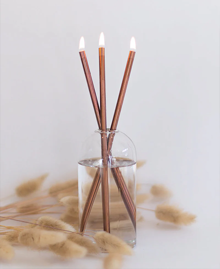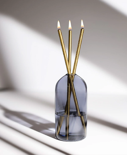 A candle that never melts, designed to bring lasting light into your home. Handcrafted in Vancouver, this minimalist set combines steel candles, a glass vase, and clean-burning Pristine Oil® for a modern take on timeless ambience.