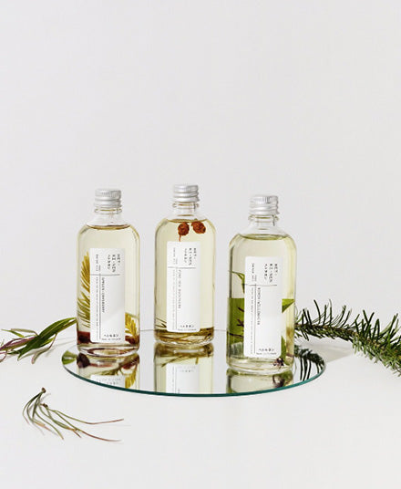 Pine & Sea Buckthorn: This gentle body oil is infused with highly nutritious sea buckthorn oil and pine needle extract. Sea buckthorn oil is antibacterial and packed with antioxidants, and has been used for various skin issues such as inflammation, redness, dry skin and acne. Pine needles are rich in carotenoids and vitamin C, soothing and improving circulation in the skin. The base of the body oil consists of well-absorbing and nutrient-rich almond and grape seed oils, and the essential oils of pine, palmarosa and bergamot enhance the overall experience, making it even more enjoyable.