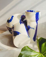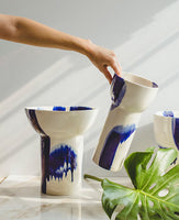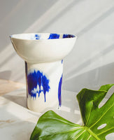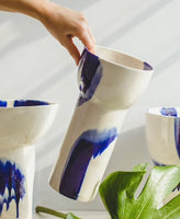 Blue and white brush strokes set this glossy white vase in motion, creating a unique pattern each time.
