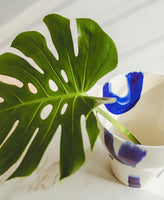 - Porcelain, creamy white and watercolour blue colours, food-safe glossy glaze.